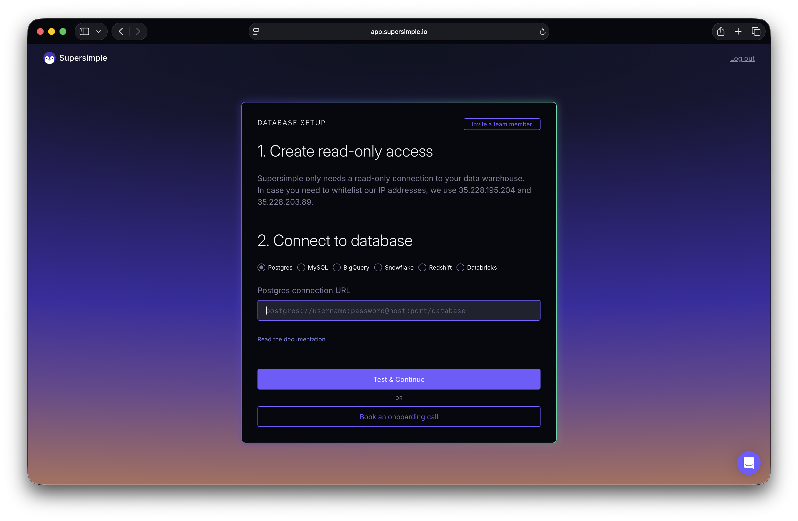 To get started with Supersimple, you'll just need to connect your data warehouse (or database). Supersimple only ever needs a read-only connection to your database, and it's best to create a separate database user for it.